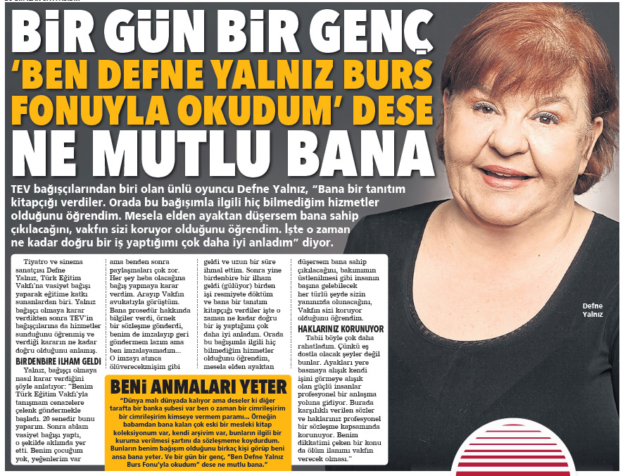Tiyatro ve sinema sanatçısı Defne Yalnız, Türk Eğitim Vakfı’na vasiyet bağışı yaparak eğitime katkı sunanlardan biri. Yalnız bağışçı olmaya karar verdikten sonra TEV’in bağışçılarına da hizmetler sunduğunu öğrenmiş ve verdiği kararın ne kadar doğru olduğunu anlamış.
