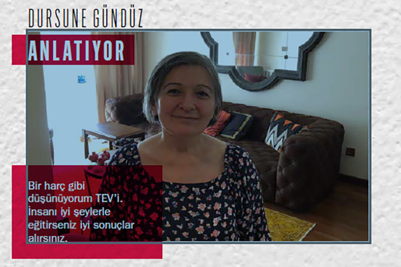 Aydın ve güçlü bir Türk kadını olarak ülkenin parlak gençlerine destek olmak amacıyla TEV’i seçtiğinde 37 yaşındaymış Dursune Gündüz. Yaptığı bağışıyla TEV ailesine katıldığından bugüne kadar hiçbir toplantıyı kaçırmamış ve her seferinde gurur duymuş, bursiyer gençleri tanımaktan ve başarılarına şahit olmaktan.